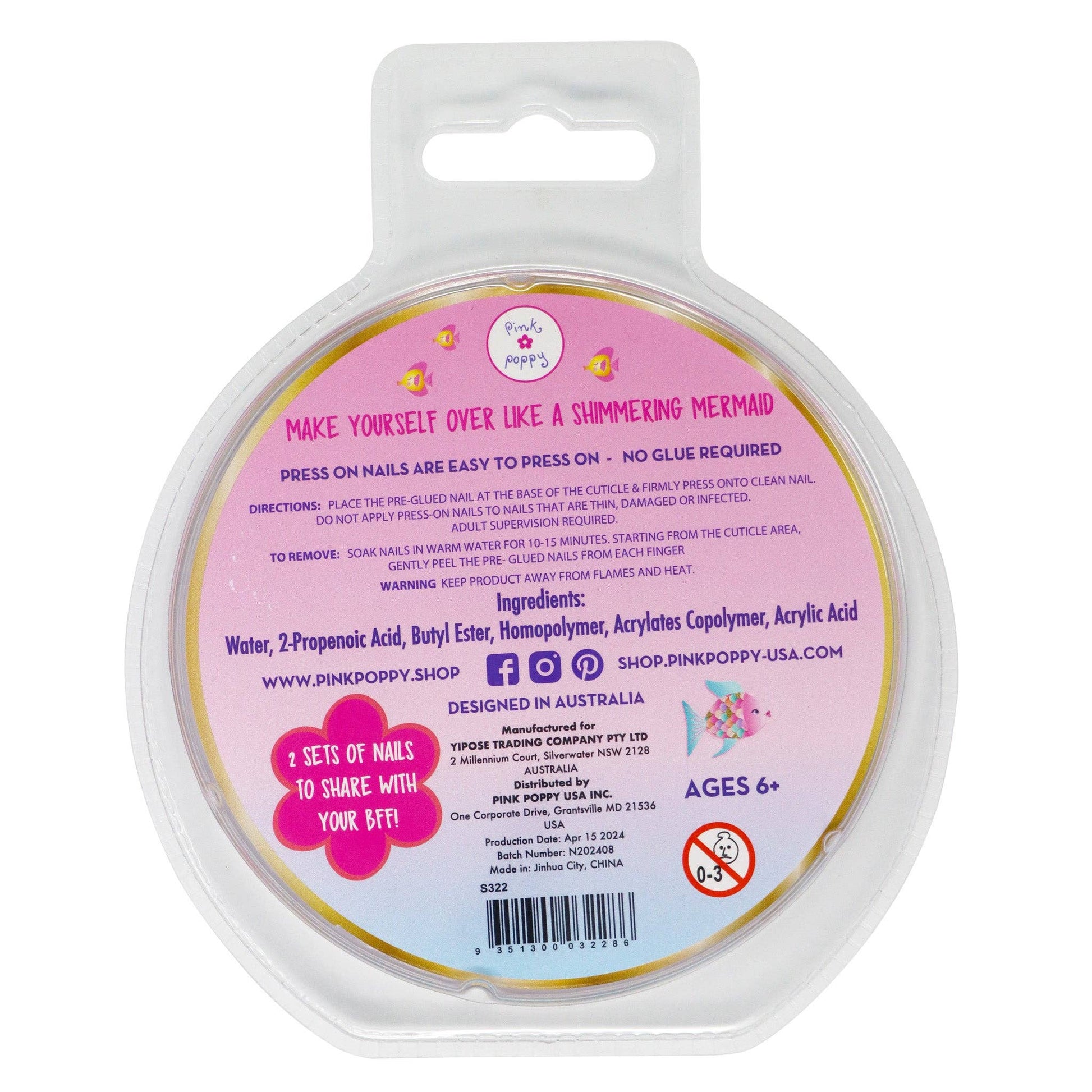 Complete your Mermaid outfit with Pink Poppy's Enchanted Mermaid Press On Nails. They come with an adhesive back so that they are easy to press on with no glue required! Place the pre-glued nail at the base of the cuticle and firmly press onto the clean nail for an instant makeover. No mess, no dry time. To remove, soak in warm water for 10 minutes. Starting from the cuticle, peel the nails off the fingers. The pack comes with 20 nails for 2 applications or to share with your bestie.
