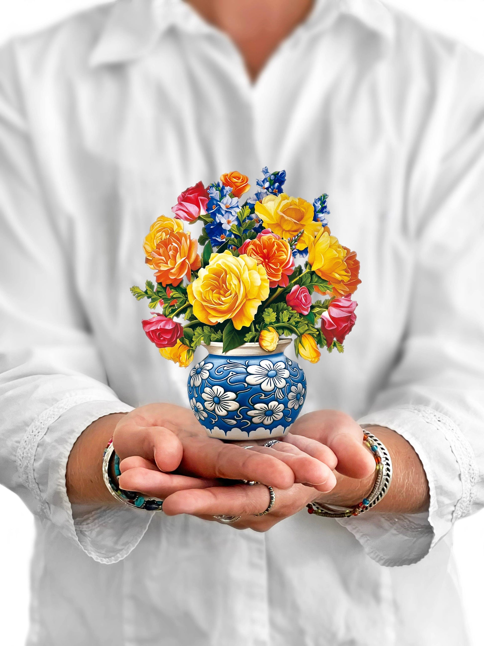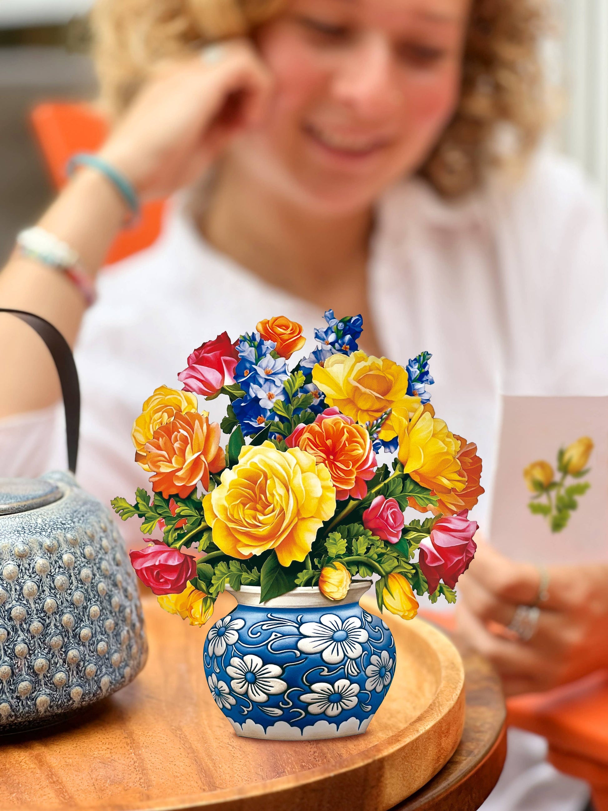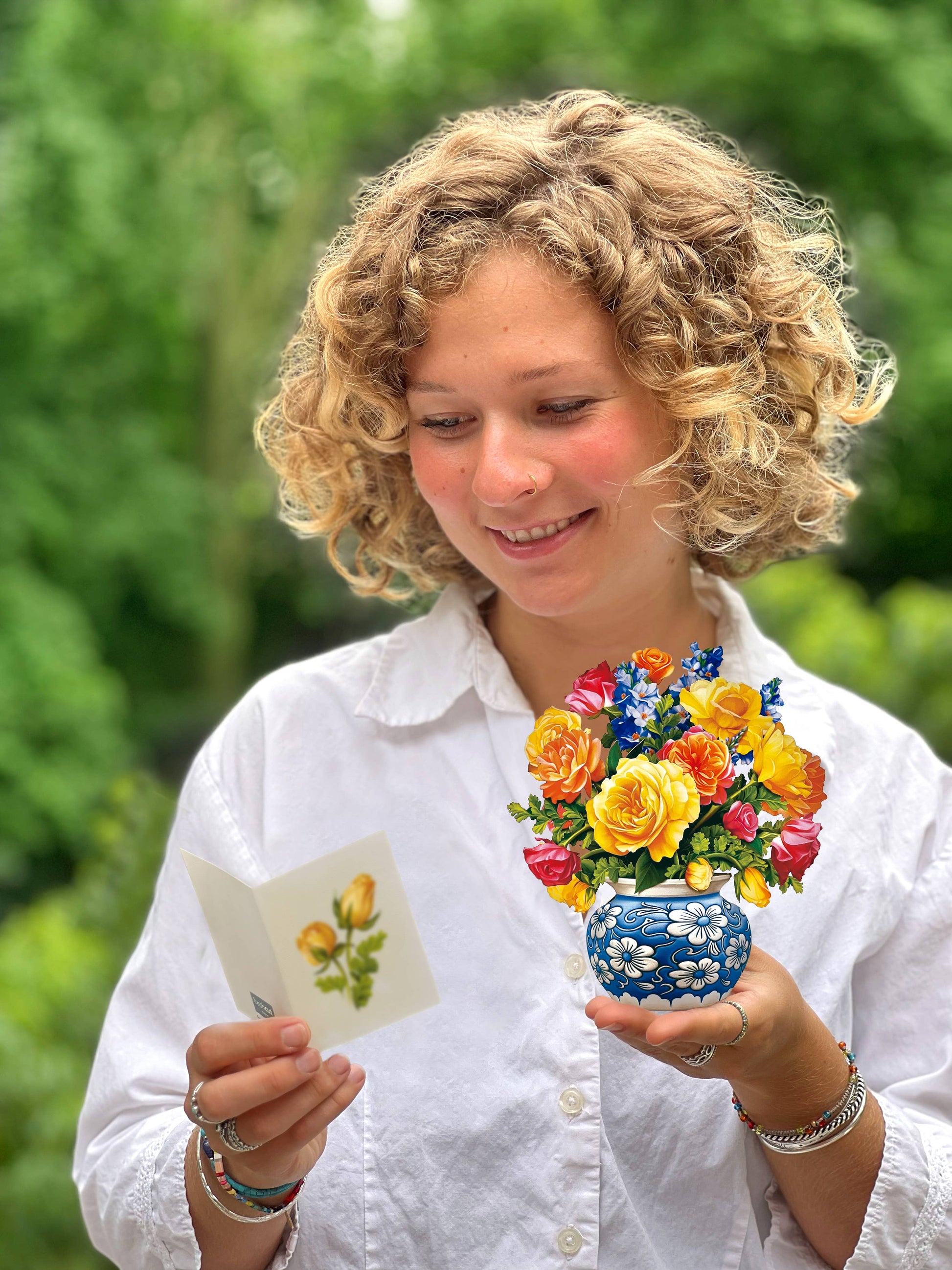 Mini Sorbet Roses. Each pop up flower card includes a small blank coordinating notecard. A bright and refreshing pick-me-up in a perfectly petite size. Decadent shades of raspberry red, tangerine, strawberry pink, and limoncello burst from an array of roses, alongside snapdragon accents in a fitting floral-print ceramic vase.