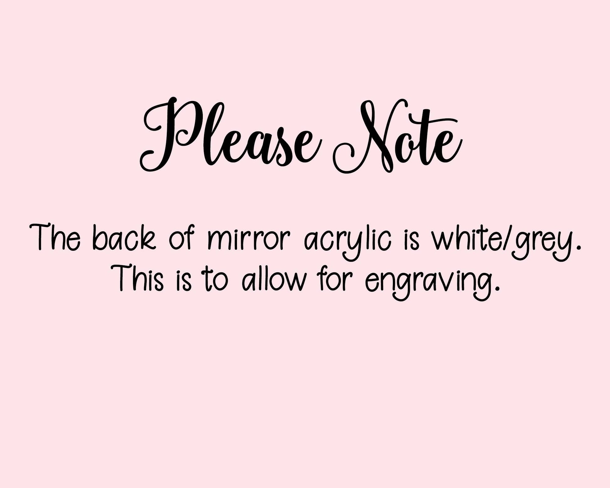 - Made with pink mirror acrylic. The back of mirror acrylic is grey to allow for engraving