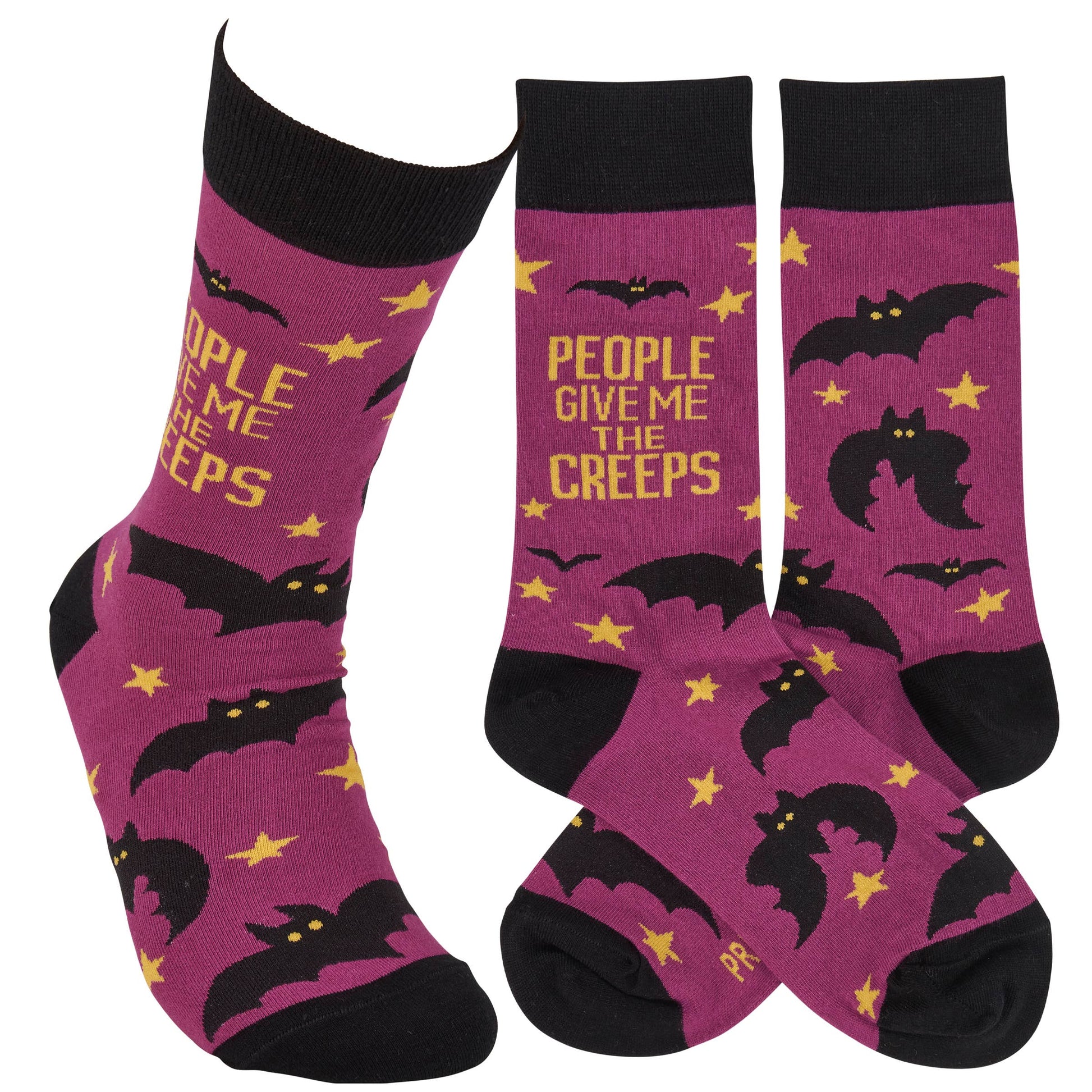 A pair of colorful socks from our Halloween Collection displaying unique hand illustrated designs of bats at night with a fun seasonal sentiment that reads "People Give Me The Creeps." Seasonal socks feature a one size fits most design made with cotton, nylon, and spandex. Our The Creeps socks come with a header card and a clear plastic hanger for display. A fun Halloween-themed gift perfect for seasonal self-expression.