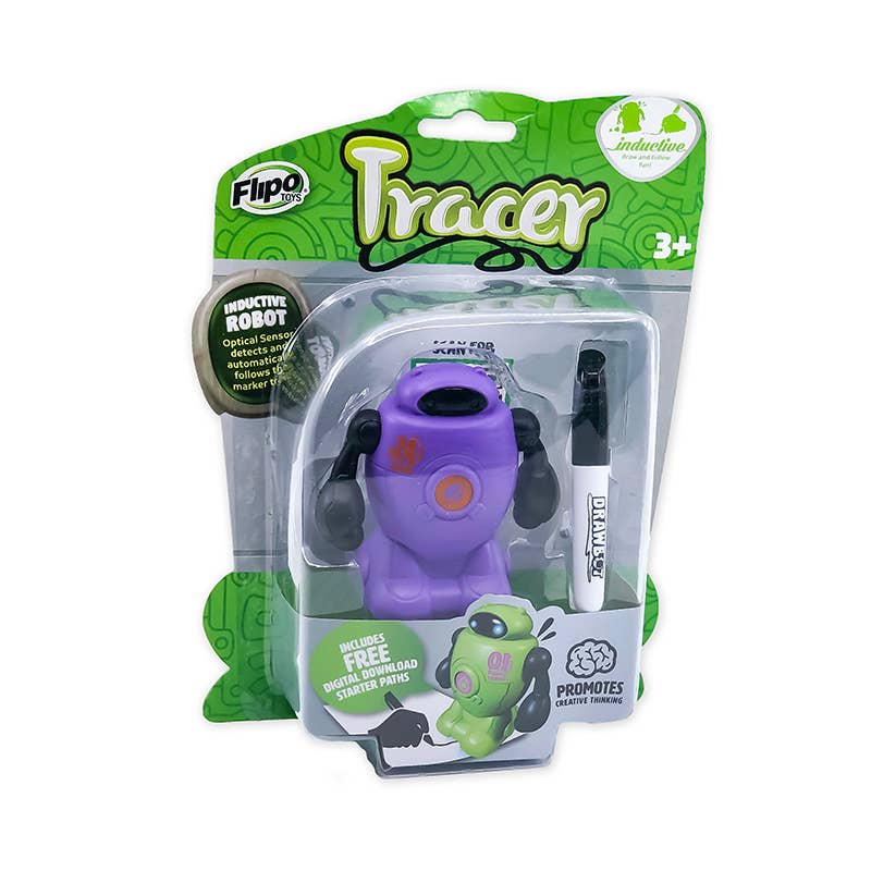Draw a line and watch your Tracer follow it! Using optical sensors, Tracers will track the path of black lines drawn on white paper. Paper can be taped together, allowing for ever increasing and complex paths for your Tracer. As an added bonus we’ve included downloadable and printable “starter” paths for every beginner! Measuring approximately 2 3/8” x 1 3/4" x 3", each Tracer Robot is available in blue, red, purple or green and requires 4 AG13 batteries, (included). Blaze your own unique trail with Tracers!