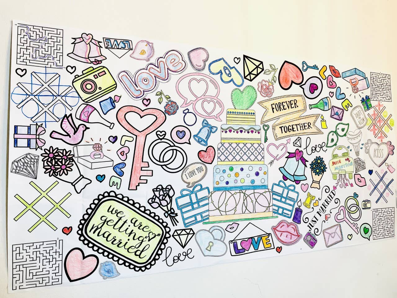 Are you having a kid-friendly wedding and need a fun, unique way to entertain them? This GIANT coloring sheet filled with images that are all things wedding will keep them creatively occupied for hours. Warning, adults may enjoy this too!